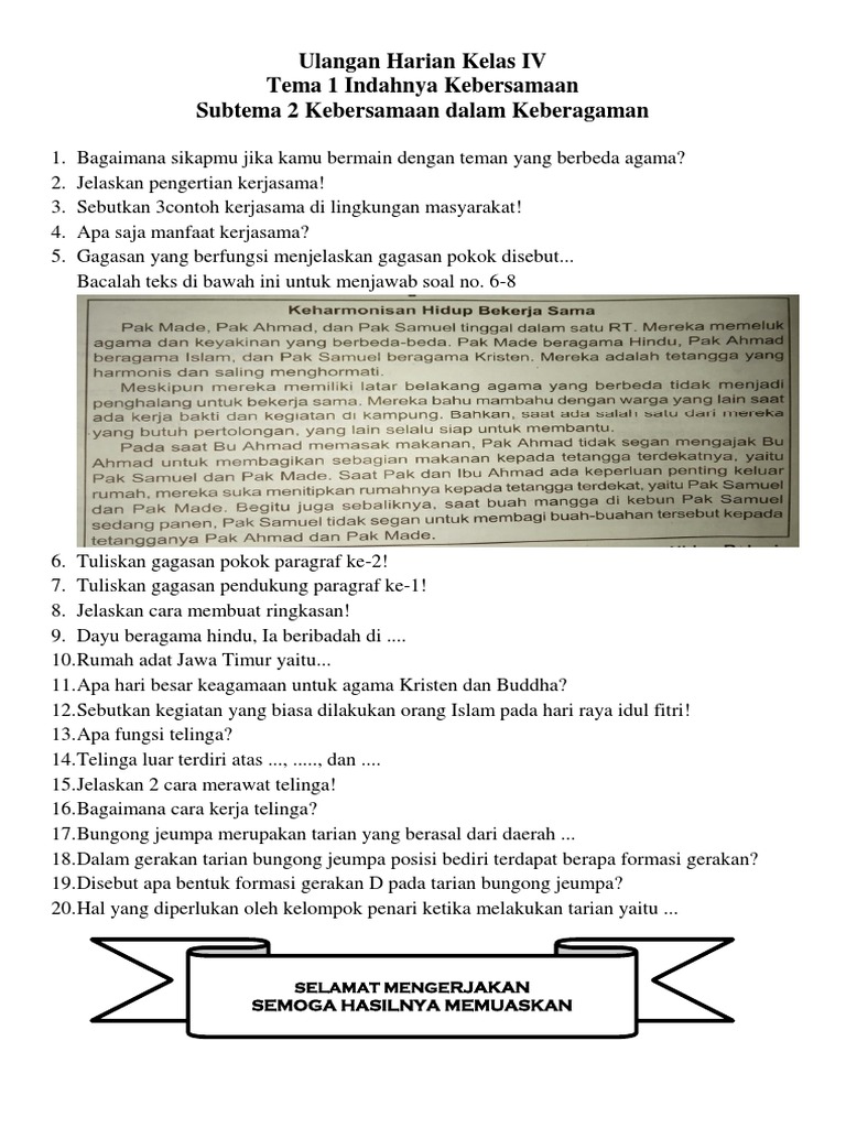 Soal ulangan harian semester dua tahun 2016 \ 2017 nama ; Permainan dan olah raga 1. You can do the exercises online or download the worksheet as pdf. Pada kali ini kami akan membagikan latihan soal kelas 5 sd mi yaitu tema 3 tentang makanan sehat, subtema 3 tentang pentingnya menjaga asupan makanan sehat. Pada soal kelas 4 ini temanya adalah indahnya keberagaman dengan subtemanya adalah keberagaman budaya bangsaku.